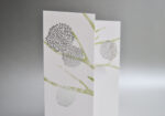Přání na Italském grafickém papíru s barevným potiskem a laserovým výsekem. Balení obsahuje stříbrnou obálku velikosti 22x11cm s ručním razítkovým potiskem. Pro snadné psaní je zadní strana přání potištěna linkami.
