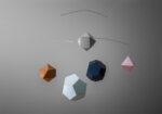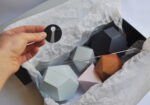 All assembled, ready-to-suspend paper mobile decorations are packed in a gift box. The 5 solids are slowly rotating in the air. The box is 19x35x12cm.