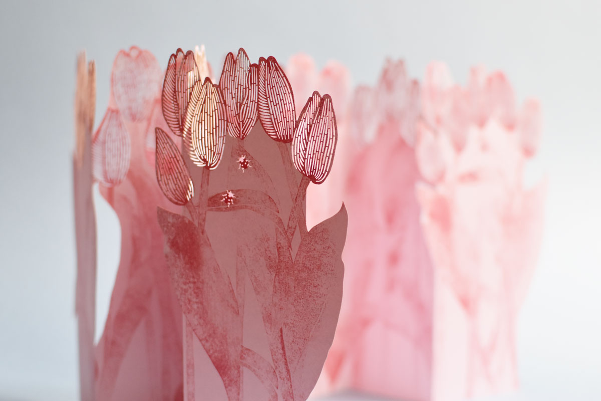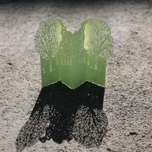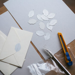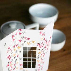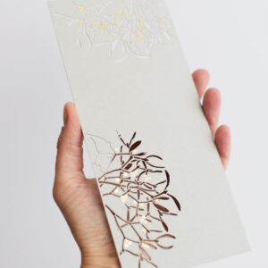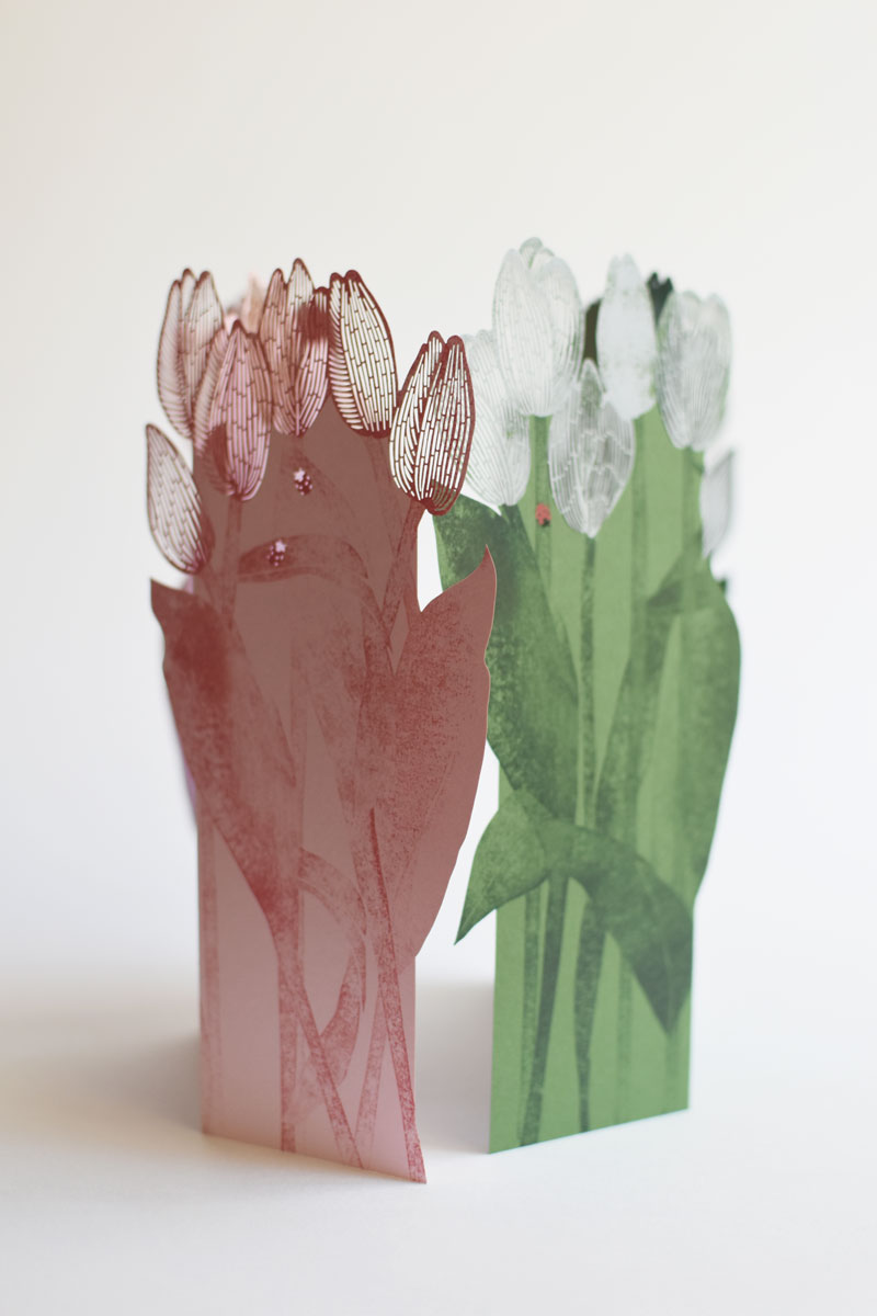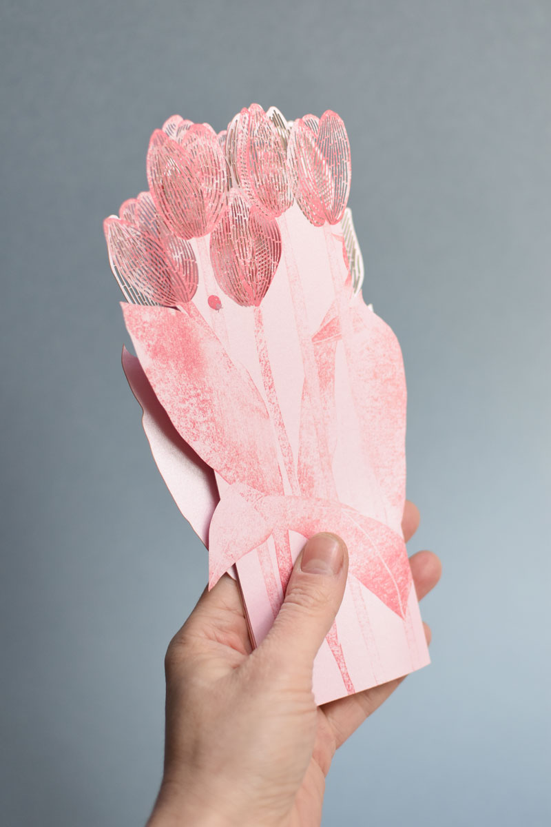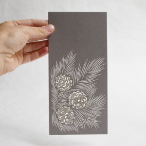 Printed and laser-cut card on high-quality Italian graphic paper. Packing includes a 22 x 11 cm blue envelope with a hand-printed stamp. Empty lines at the back of the card for easy writing.